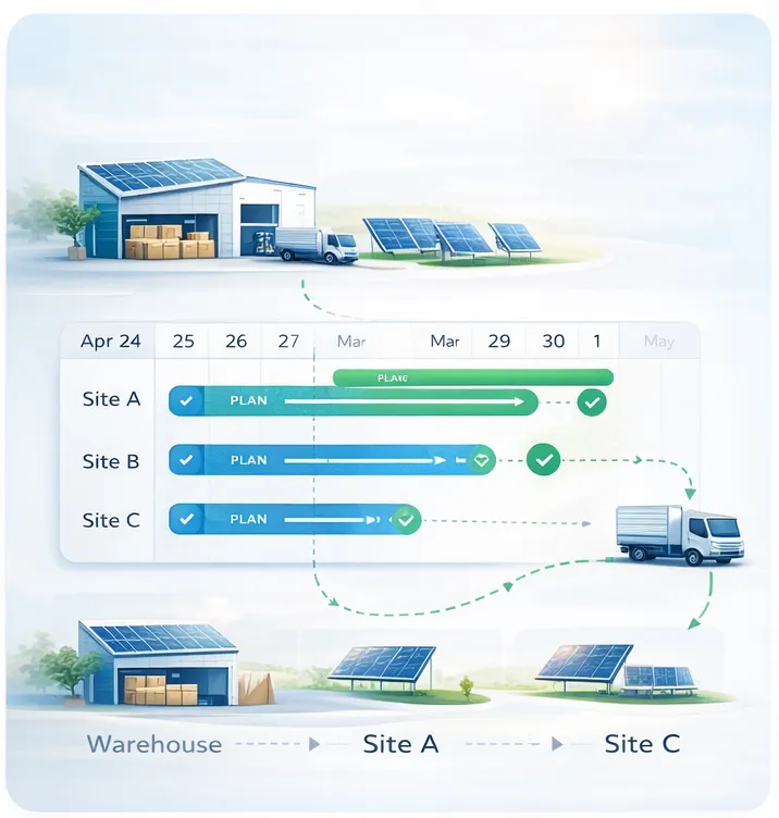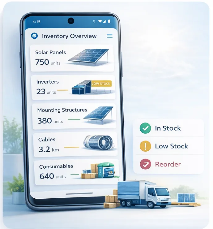 Track stock levels of solar panels, inverters, mounting structures, cables, and consumables.