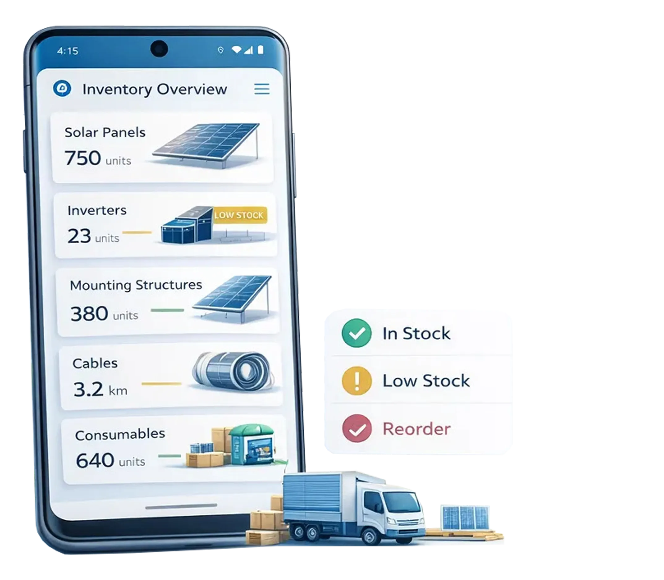 Track solar panels, inverters, mounting structures, cables, and consumables across multiple warehouses — and avoid costly stockouts or emergency purchases.